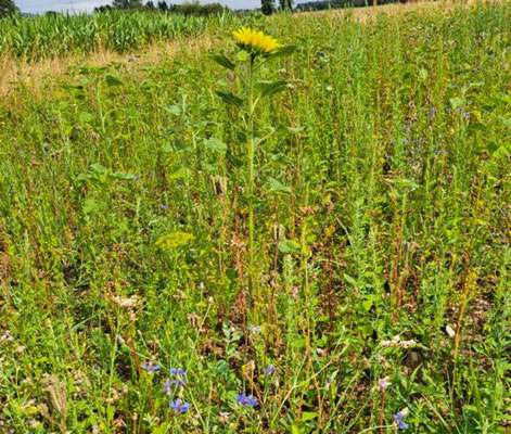Seit 2020 wurden auf der Opfinger Gemarkung rund 12 ha verstreut liegende Äcker mit einer mehrjährigen zertifizierten Wildblumenmischung (Fakt E8) eingesät.