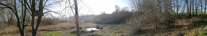 Gelände eine aufgeschüttete feuchte Wiese sowie einen ausgedehnten Röhricht- und Seggenbestand. Im Außenbereich geben Feldgehölze und Weidenbestände von allen Seiten Sichtschutz. Das Gewann